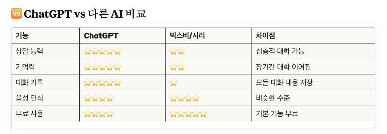 상담 전문성: "빅스비는 '날씨 알려줘', '음악 틀어줘' 정도인데, ChatGPT는 정말 상담사처럼 대화해요. '왜 그렇게 생각하세요?', '다른 관점에서 보면 어떨까요?' 이런 깊은 질문을 던져요."