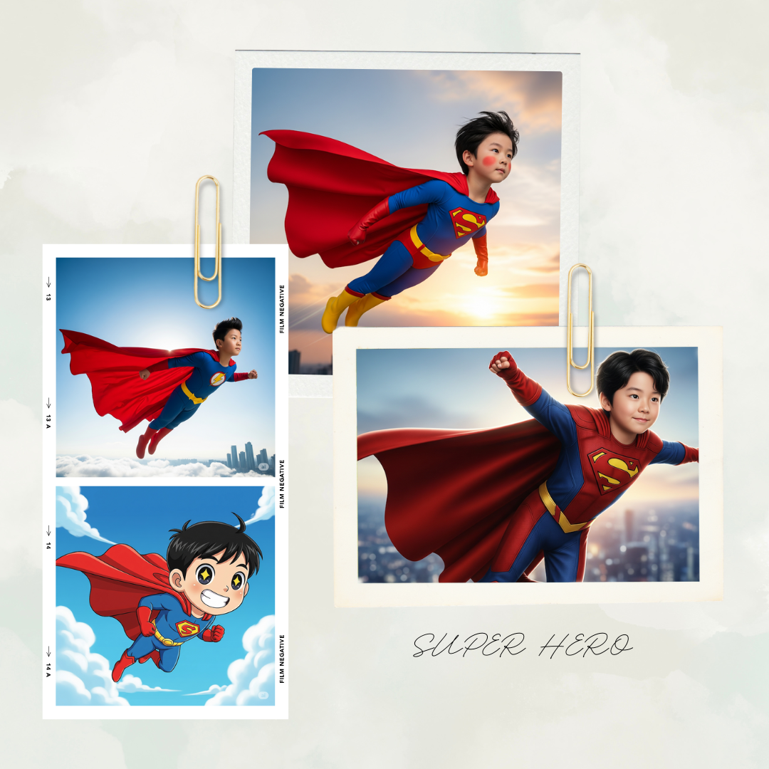 첫 번째: 제미나이 도전 "8살 남자아이를 슈퍼히어로로 그려주세요. 빨간 망토를 입고 하늘을 날고 있는 모습으로요"